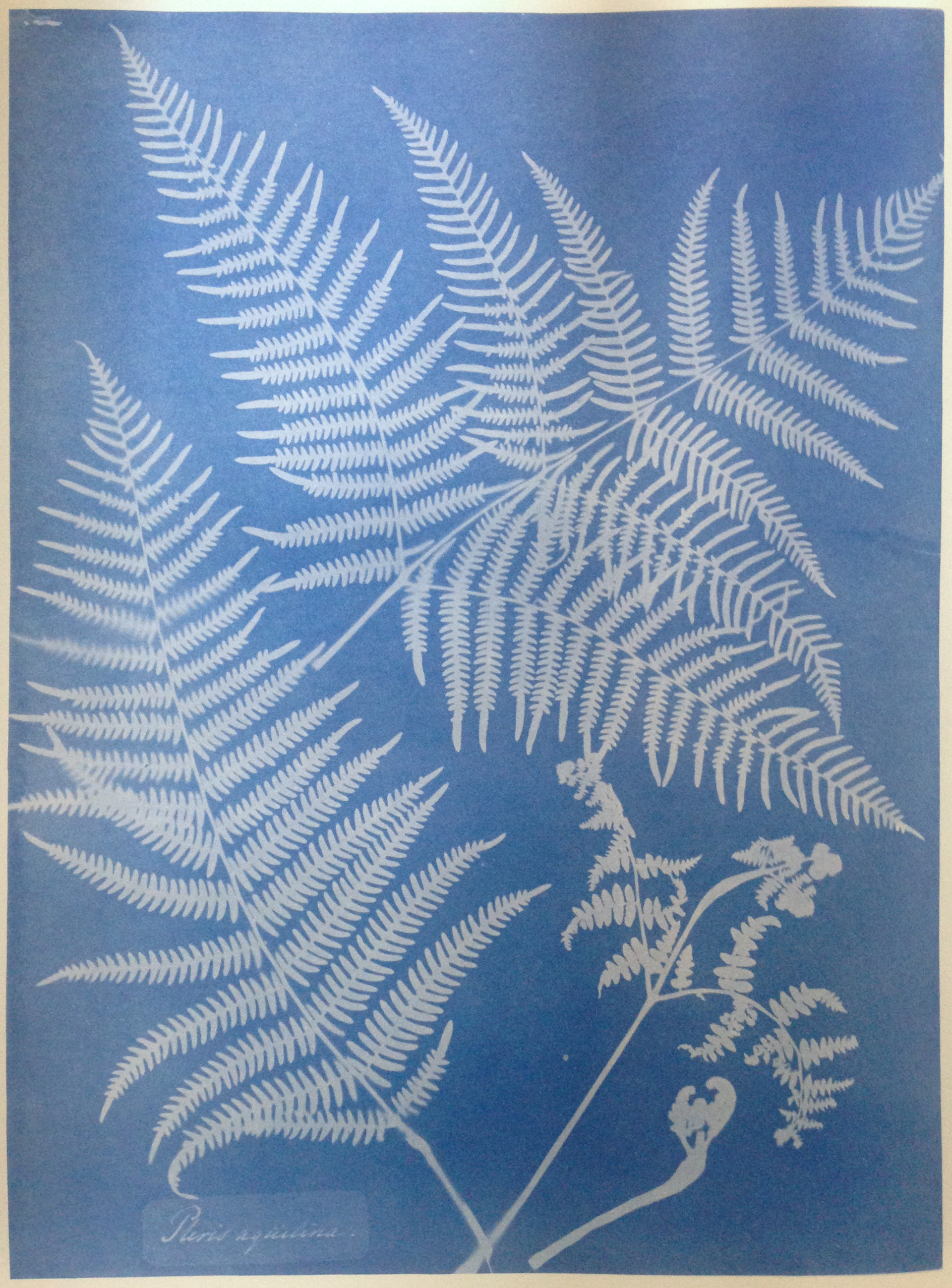 In addition to seaweed, Atkins created cyanotypes representing ferns, flowers, grasses, feathers, and lace. Instead of describing highlights and shadows, lights and darks in cyanotypes describe variations in density - how much or how little light passes through translucent and opaque parts of a subject positioned directly on light-sensitive paper during exposure.